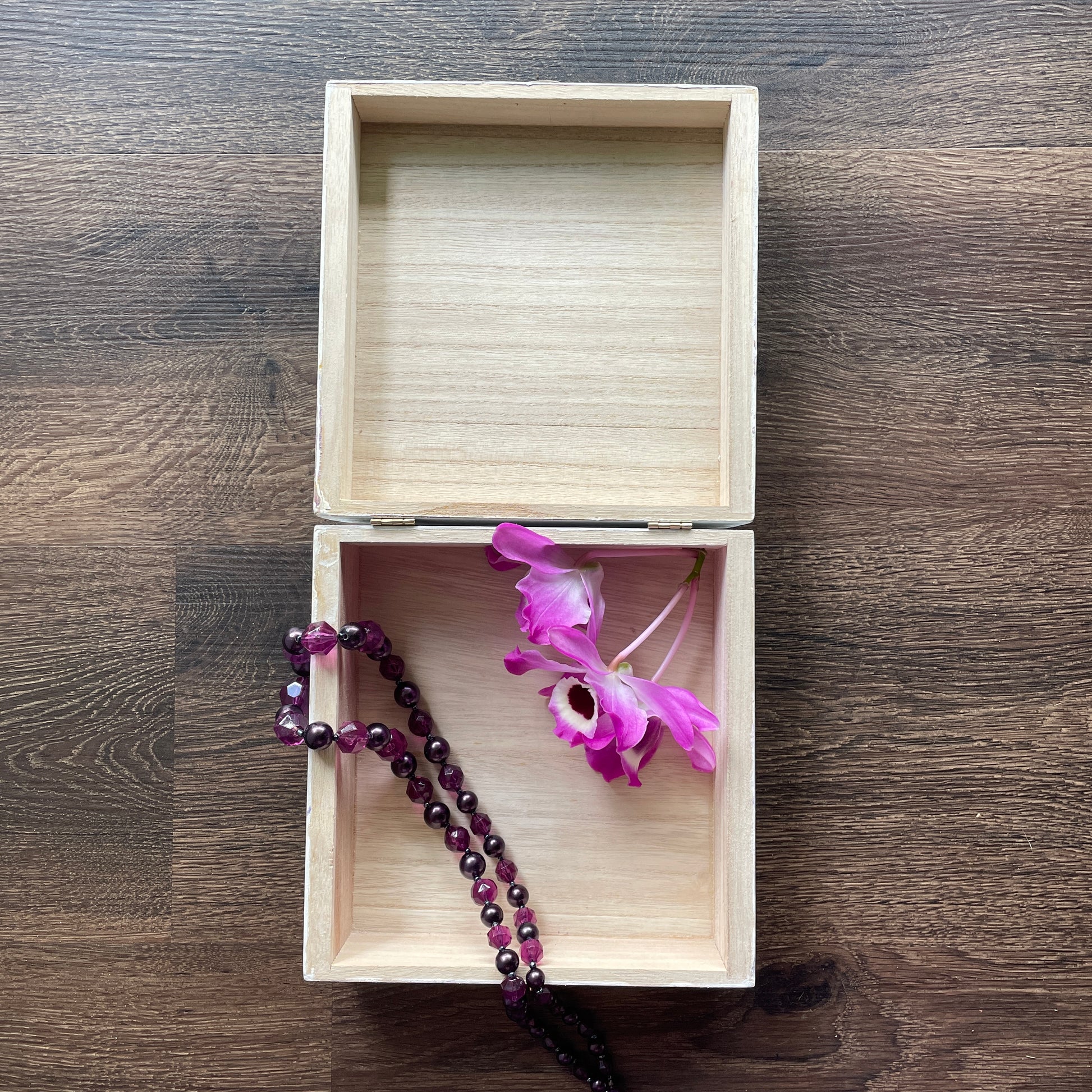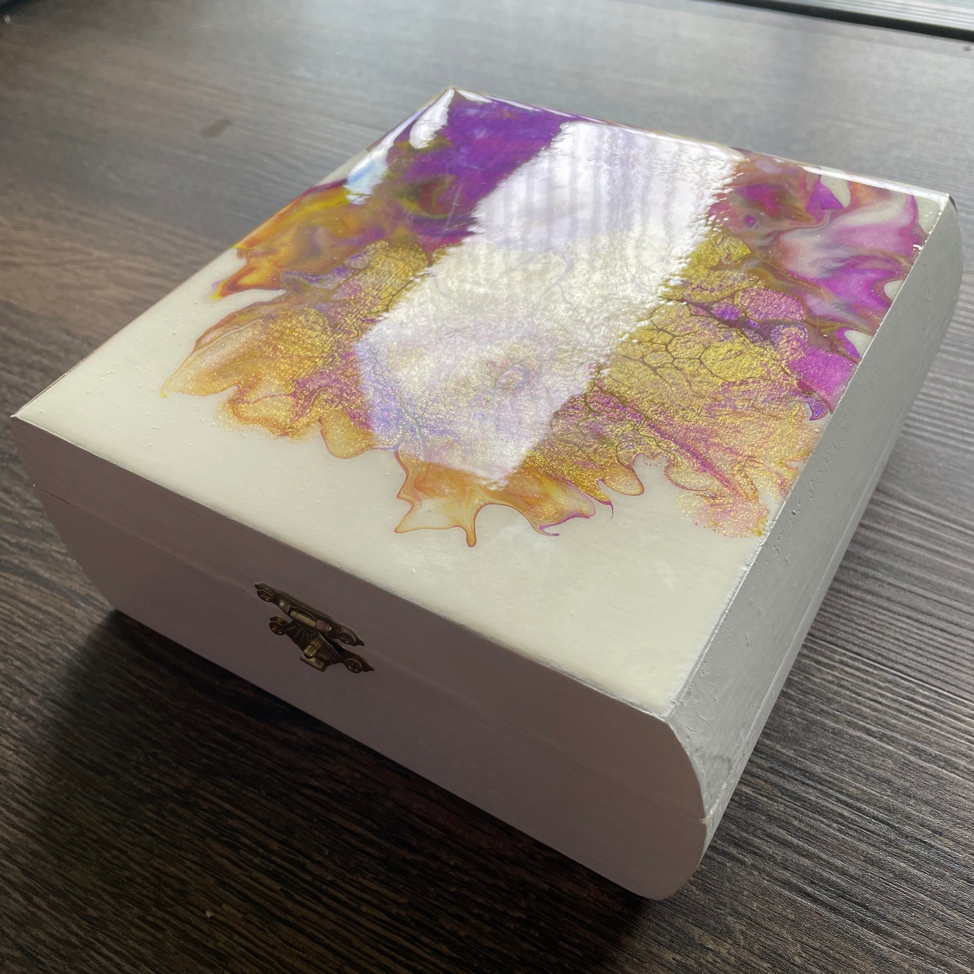 Beautiful painted keepsake box with purple and yellow abstract hibiscus design. Perfect for holding jewelry and all the little things!