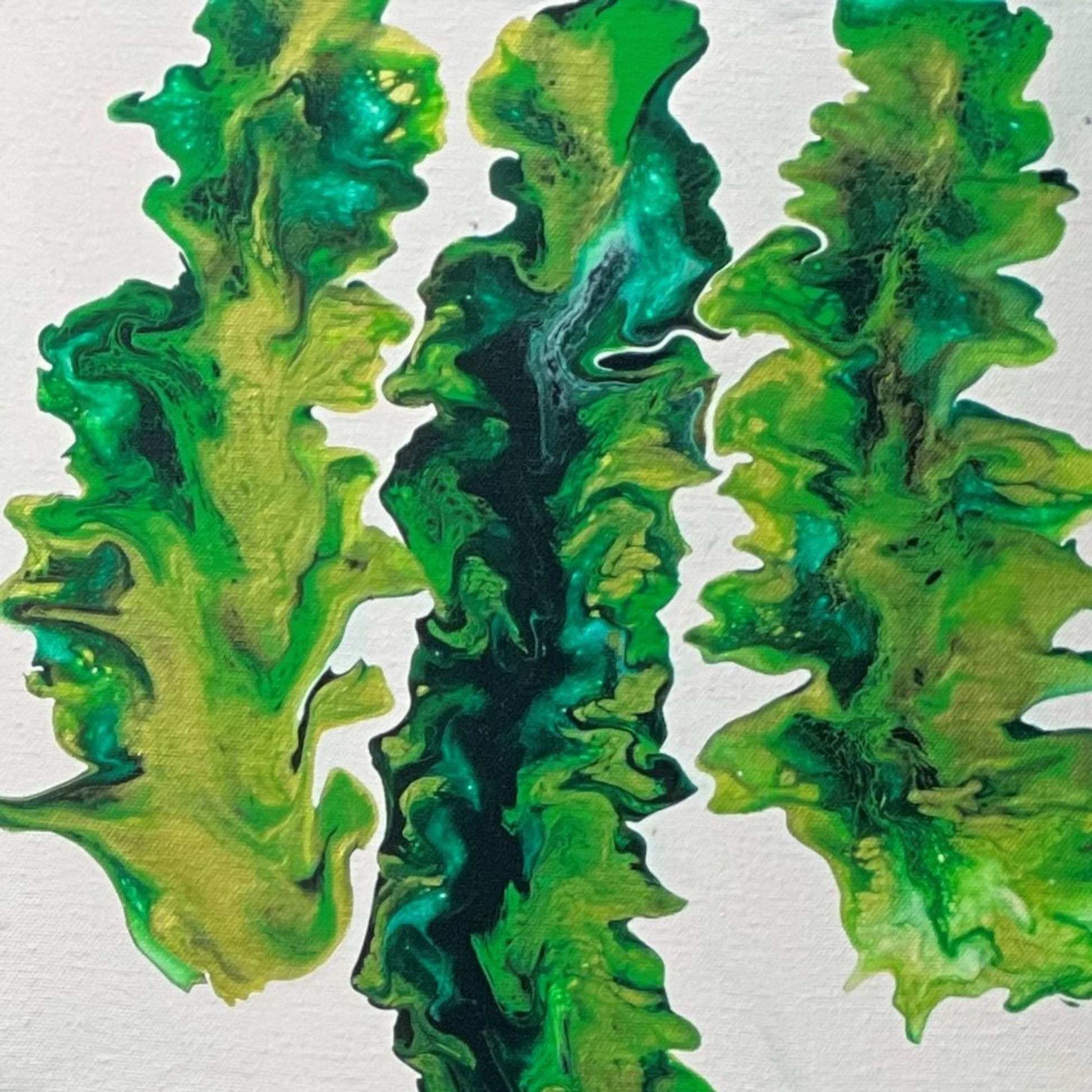 The look was achieved pouring acrylic paint and additives and manipulated with air to create abstract coral, inspired by Hawaii's reefs. Finished and sealed with a glossy varnish to add shine and depth.